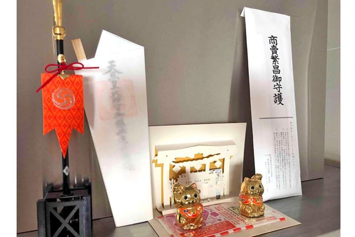 招き猫は人が見下ろさないような高い場所に飾ることが大切。伊勢神宮で購入した開運グッズと並べてパチリ