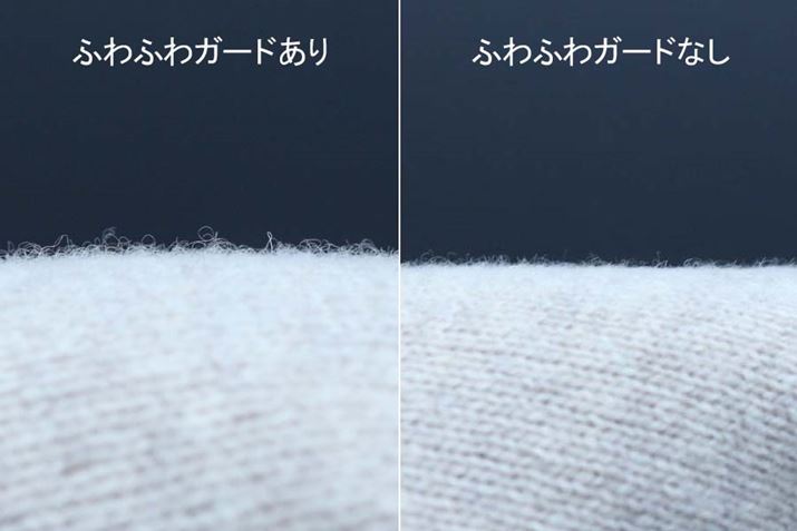 「ふわふわガード」は、生地の状態や毛玉の大きさによって、3段階に高さを調整できます「高」は毛足の長い生地や番手の太いセーターなどに。「中」は毛足が長めの生地、並太の毛糸のセーターなどに、「低」は毛足の短い生地に。ジャージやトレーナーは、「ふわふわガードなし」で使用できます