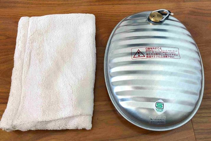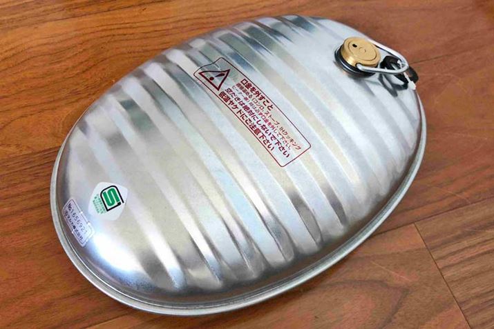 なお、金属製の湯たんぽは、直(じか)火やIHクッキングヒーターに対応した商品もありますが(筆者が購入した「マルカ 湯たんぽA(エース)2.5L 袋付き」は直火やIHクッキングヒーターもOK)、すべての金属製湯たんぽが対応するとはかぎりません。加熱方法をあやまると本体が熱くなりすぎてやけどの危険性が高まりますし、本体の劣化が早まる可能性もあるので、取扱説明書をよくご確認ください。また、金属製湯たんぽの電子レンジでの加熱は絶対にNG! ご注意ください。