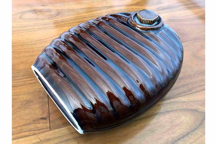 デザインは金属製と同じくレトロ調が中心になりますが、こちらは本体が陶器でできています。保温性が高いので、じわっとした温かさが長時間持続します。実際に使ってみると朝になってもぬくもりを感じられました。また、中のお湯が陶器を通じて少しずつ発散されるので、体が乾燥しにくいという特長もあります。見た目の高級感もあり、メリットの多い陶器製湯たんぽですが、陶器であるため強い衝撃で壊れてしまう可能性があります。本体も結構な重量があるので、寝ている間にベッドから床に落下させないなど注意が必要です。まあ、よほど高い位置から硬い床に落とさないかぎり簡単には壊れないと思いますが。