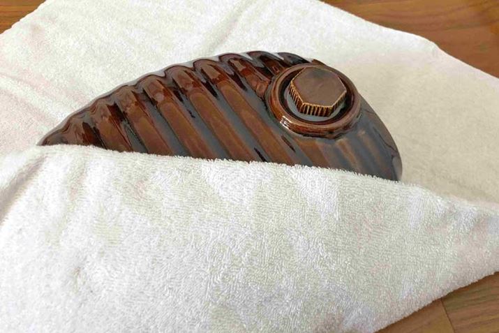 厚みのある陶器製とはいえ、やはり熱湯を入れると熱くなるので、バスタオルなどに包んで使用します。ちなみに本品は熱湯を入れると布団の中なら24時間ほど保温します