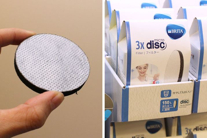 こちらがマイクロディスク カートリッジ単体。製品パッケージには1個付属します。水のミネラル成分はそのまま保ちながら、塩素や総トリハロメタン、味やニオイに影響するJIS 9項目の物質を除去できるそうです