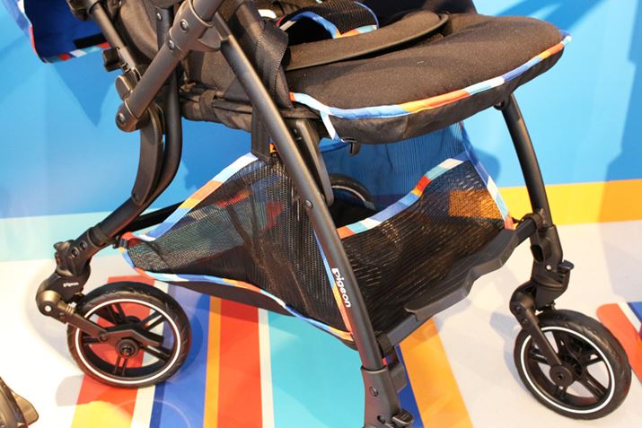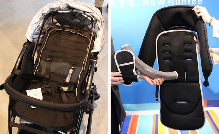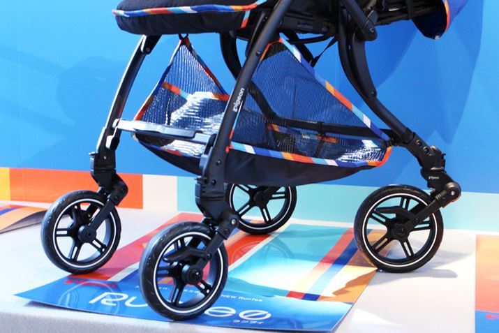 ベビーカーは首がすわっていない生後1か月から使える「A型」、首や腰がすわってきた生後7か月頃からの使用が推奨されている「B型」に分類されます(日本のSG(安全基準)にもとづく)。Runfeeは「A型両対面ベビーカー」で、ピジョンのラインアップの中では中価格帯の一番のボリュームゾーン。重量が5.3kgと軽く、操作性がいいことが特徴です。その操作性のよさを実現する大きな鍵を握るのが、シングルタイヤ。一般的に軽量タイプのベビーカーにはダブルタイヤが採用されていることがほとんどですが、ピジョンはママの使いやすさと赤ちゃんへの快適性を重視し、シングルタイヤにこだわっています。単純に考えるとタイヤが2つあるダブルタイヤほうが重量は増しそうな気がしますが、シングルタイヤのほうが精巧な設計や部品が求められるため、重くなりやすいのだそう。さらに、Runfeeは同ランクのベビーカーに多い13.8cm径のタイヤよりも大きい16.5cm径を採用(2017年発売「RA7」)しているのもポイント。このような大型サイズのシングルタイヤで軽量化を図るのはとても大変だといいます。