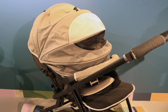 UVカットや撥水加工が施されたフードは全開できるのはもちろん、写真のように赤ちゃんをすっぽり覆うこともできます