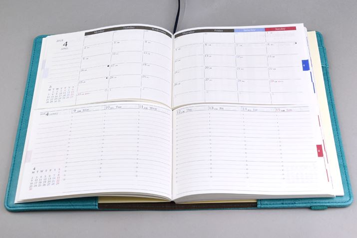 「ESダイアリー2018 4月始まり」は、週間バーチカル式(※3)ながら、土日の時間軸の代わりにメモスペースを割り当てた大胆なレイアウトを採用。バーチカル式はメモスペースのない構成が多いが、“仕事命”の人はメモをびっしりと書けるし、“週末命”なリア充な人は遊びのプランをこれでもかとたくさん書ける。