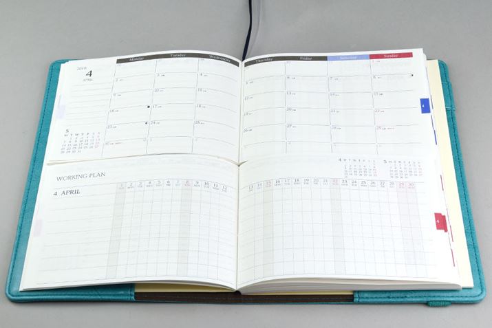 ページは上下2段式を採用。上段の月間ブロックで長期のスケジュールを確認しながら、下段の週間バーチカルに短期のスケジュールを落とし込める