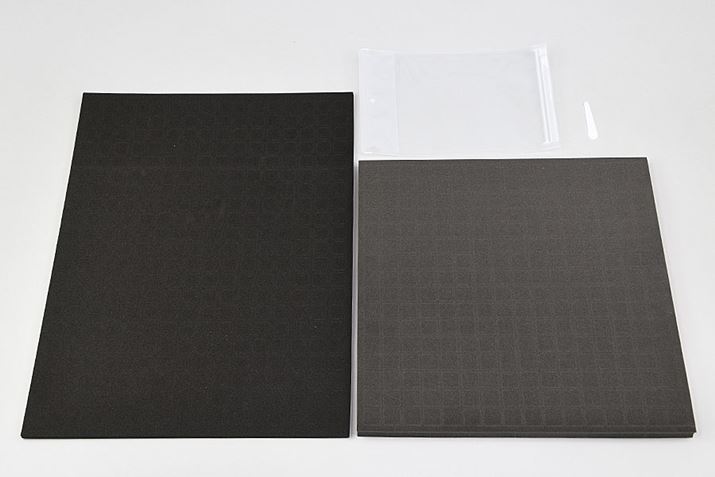 ツール整理ブロック「かたづけマス TB3415」のセット内容。ブラックのベースシート、グレーのキューブ型ブロック、ヘラ、ベース用保管袋が同梱されている
