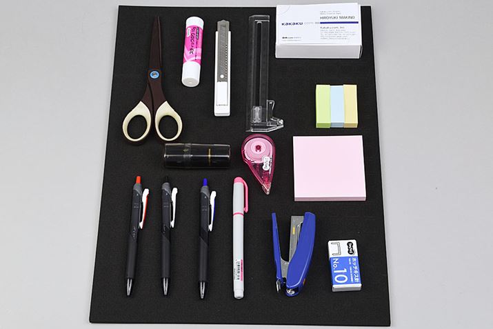 次に、レイアウトを決めるために、1軍文房具をベースシートの上に並べていく。筆者の場合、デスクの右側にある引き出しに入れるわけなので、1軍の中の“エース”である赤のボールペンやはさみ、印鑑を、自分に一番近い左側から配置していった。