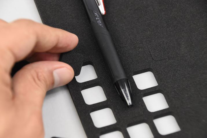 次に、文房具の形状に合わせて、その周囲のベースシートを1マスずつ取り除き、ブロックを入れる穴を開けていく。つまり、仕切りを設ける場所を確定させていく。ベースシートのマスは指でも簡単に外せるが、付属のヘラを使うとよりはかどった。