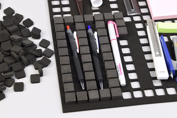 「かたづけマス」は、ツールの定位置を作れることが一番の魅力。オフィスデスクの引き出し内はもちろん、自宅では趣味のプラモデル製作に使うツールの整理などにも使える。また、会社や学校、工場現場などで備品の定位置管理にも使用可能。ひと目でツールの有無が確認できるので、紛失や混入防止にも役立つはずだ。