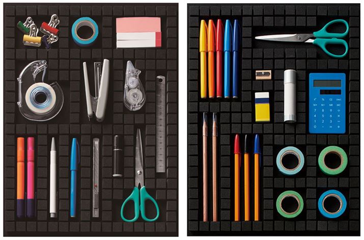 各文房具の間に、キューブ型ブロック1列の仕切りが入るように配置。外周にも1列の仕切りを想定した。ベースシートのマス目に合わせているので、並べただけで整然とし、なんだかすでに美しい