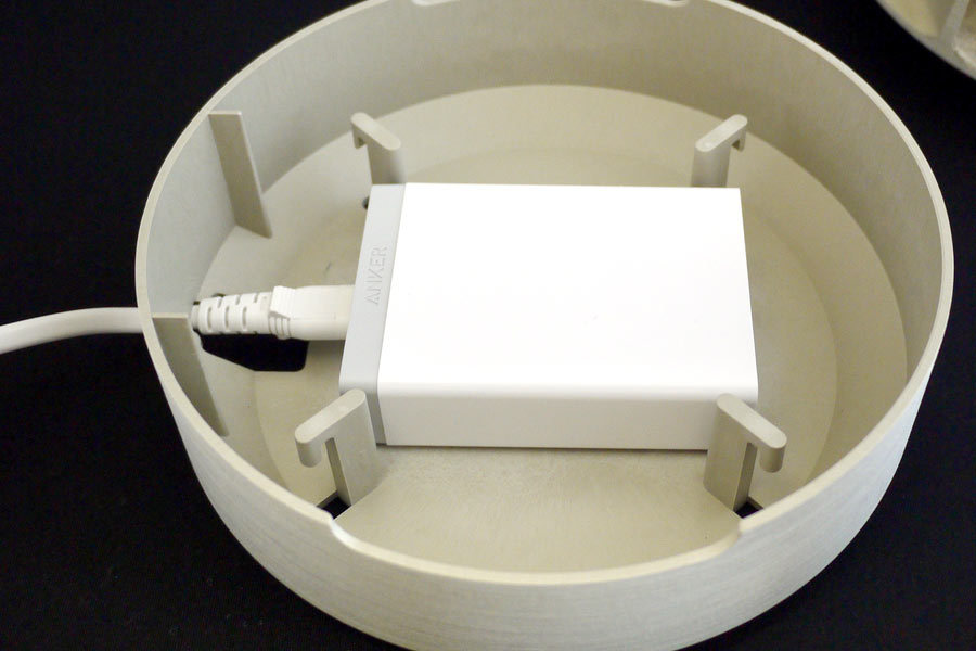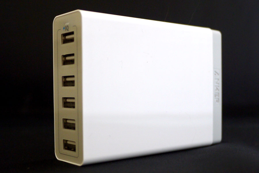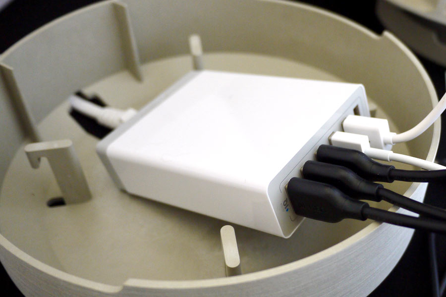 まずは最下部に充電器を設置します。繰り返しますが、COLONYはあくまでトレイなので、充電器やケーブルは別途用意する必要があります。筆者はAnker PowerPort 6(60W 6ポート USB急速充電器)をチョイス。1つの電源から6本のUSBケーブルを使ってデバイスを急速充電できる優れものです。