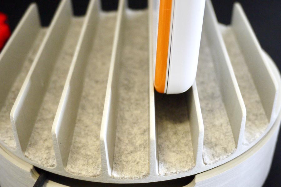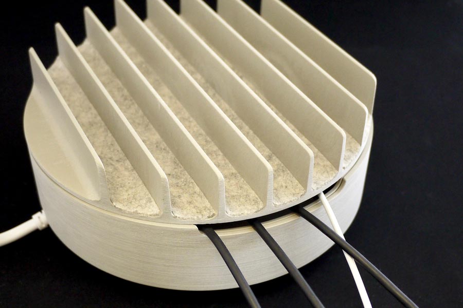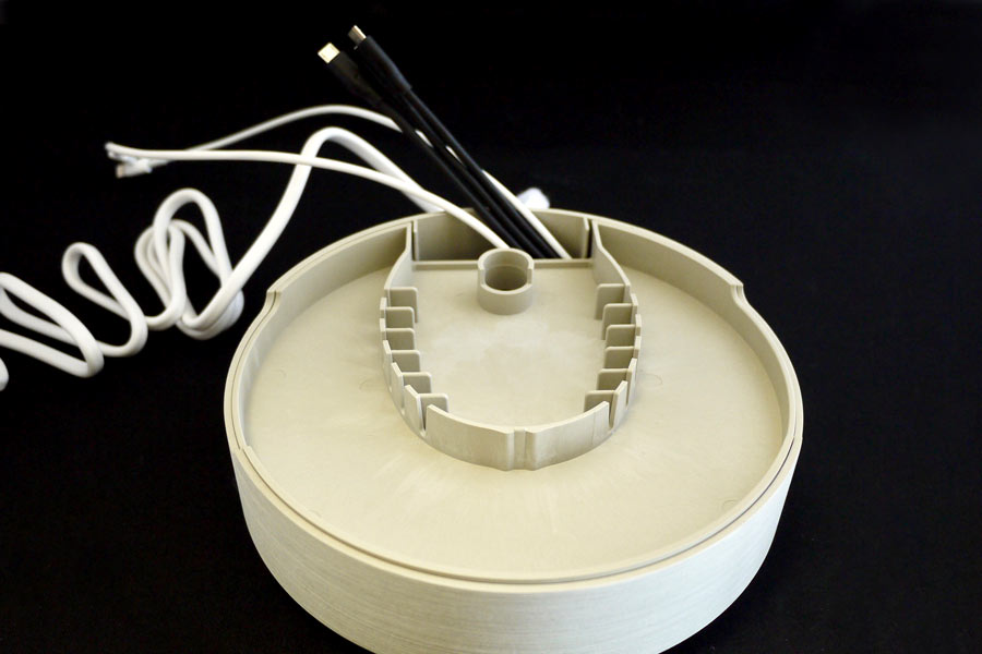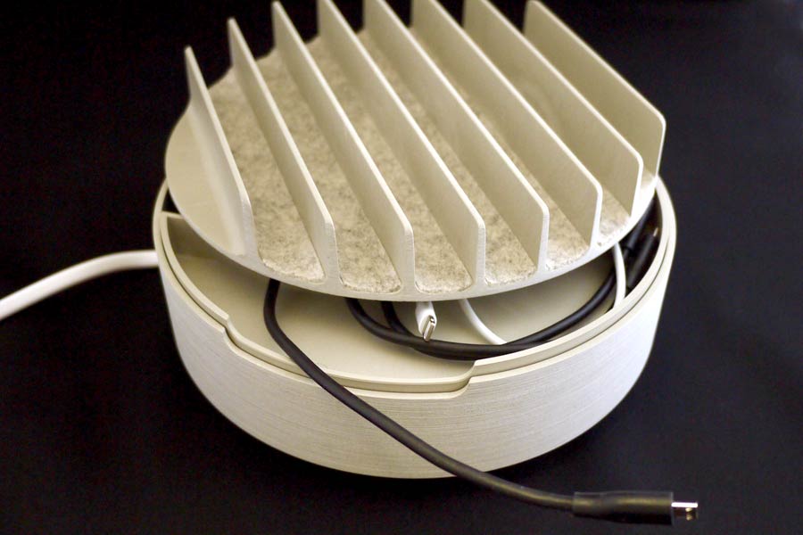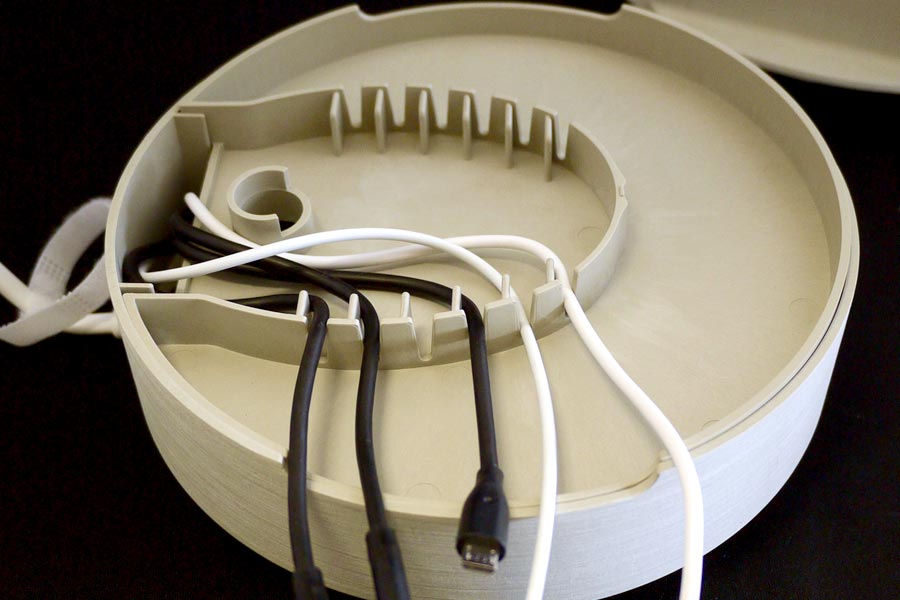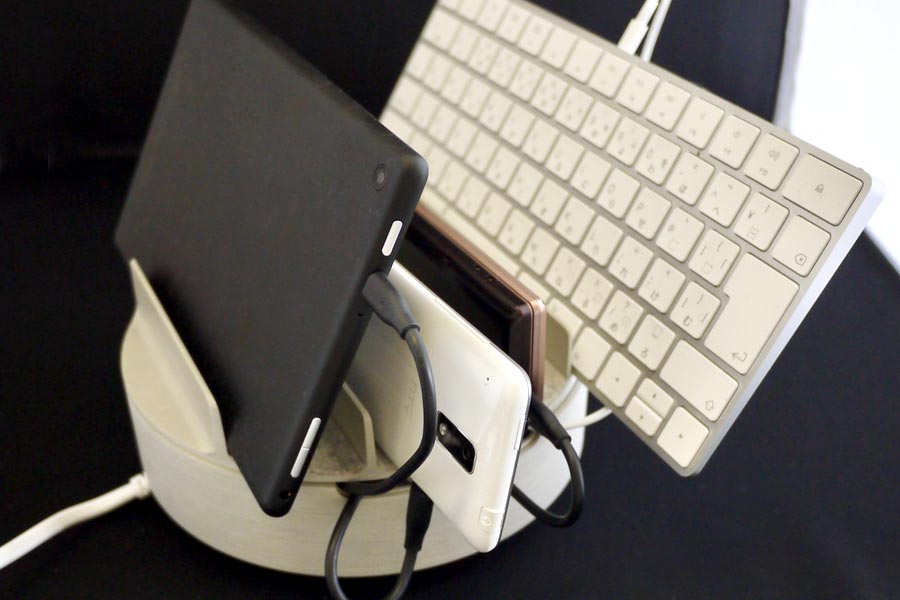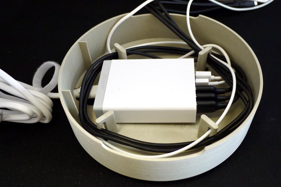 このトレイは三層構造になっており、最下部に充電器を設置し、二層目で充電用のUSBケーブルを束ねて、最上部のトレイにデバイスを収納するようになっております。これでグチャグチャとしたケーブルを見せずに、きれいにかつおしゃれに収納できるのであります。さっそくやってみましょう!