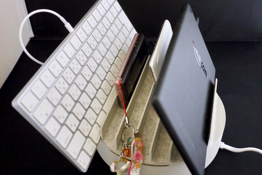 後は充電するデバイスにケーブルを挿して、トレイに立て掛ければOKです
