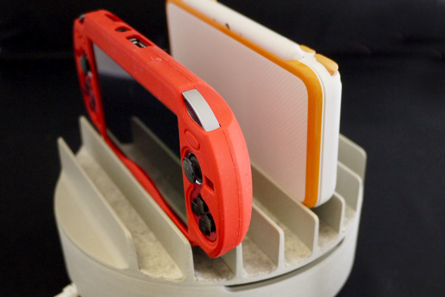 上部トレイの溝のサイズですが、最大約2cmまでの厚さのデバイスに対応しています。スマホにタブレット、携帯電話はもちろん。Mac Bookでも収納可能です。ただ筆者がよく使う携帯ゲーム機は3DS、PS Vitaともに溝に収めることはできませんでした。
