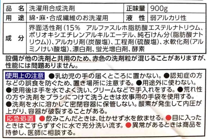 成分を見てみると「界面活性剤」が15%も入っている! オリジナル洗濯洗剤は0.5%なので、成分が本当にずいぶん違うようですね。