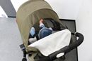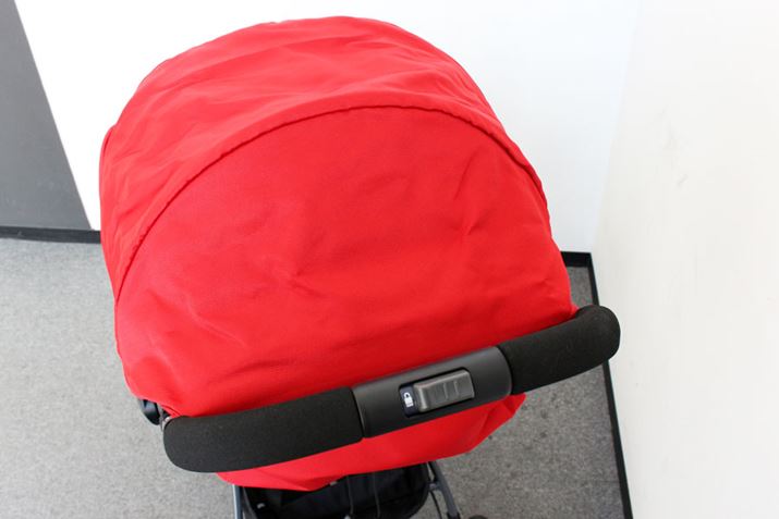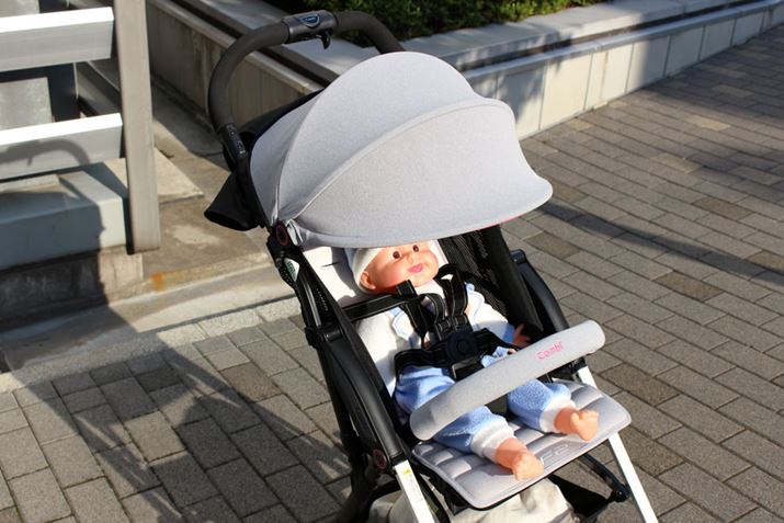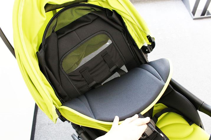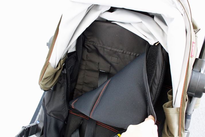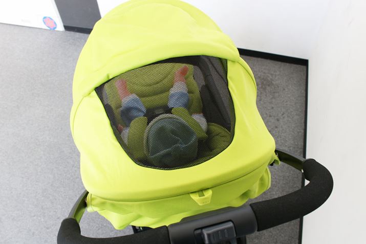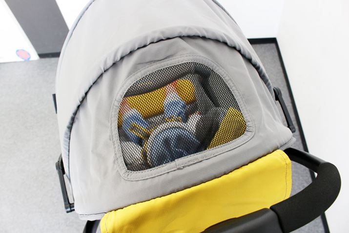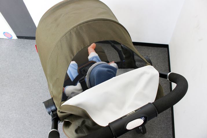 ホロの後ろ側が全開するようになっているので、風通しがバツグン。ホロ自体に赤ちゃんの様子が見えるメッシュ窓もありますが、写真のように開けて赤ちゃんとコミュニケーションを取ることもできます