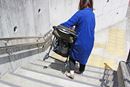 ハンドルに腕を引っかけるのが一般的な持ち方ですが、この持ち方では歩くたびに足にぶつかったり、小柄な女性の場合、持つ時や階段を上る際に地面についてしまうことも。「F2plus AJ」は写真右のように、座面下のフレームを握って持つことも可能。安定して持ち運びできます