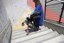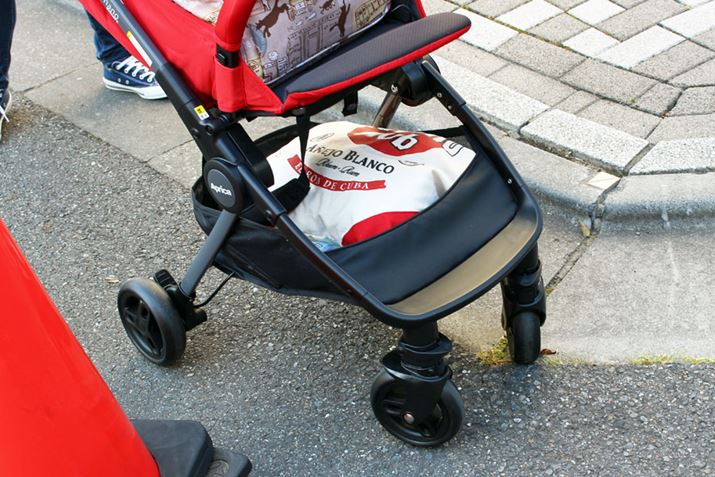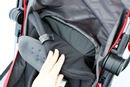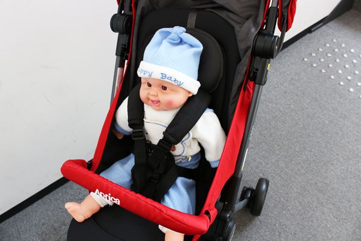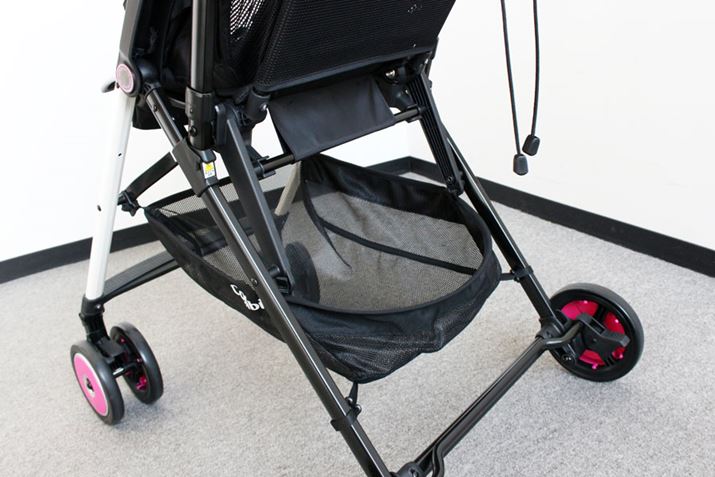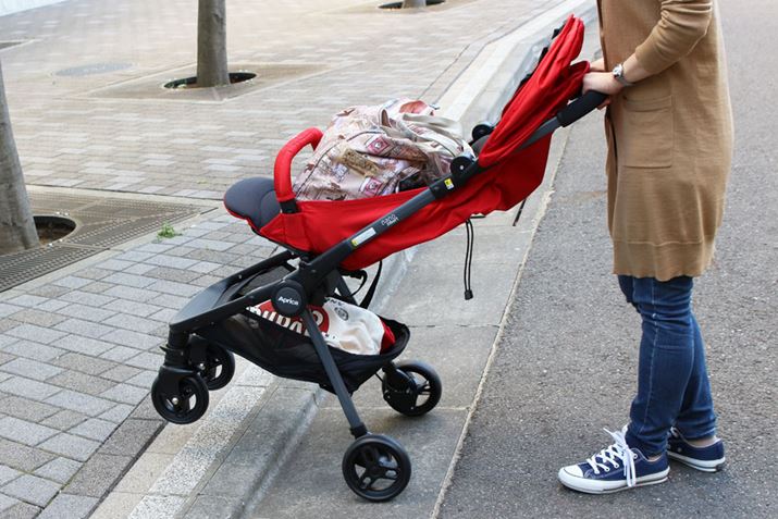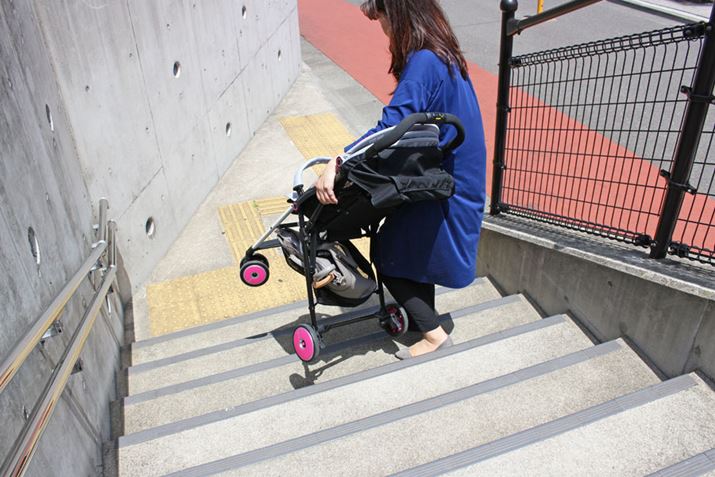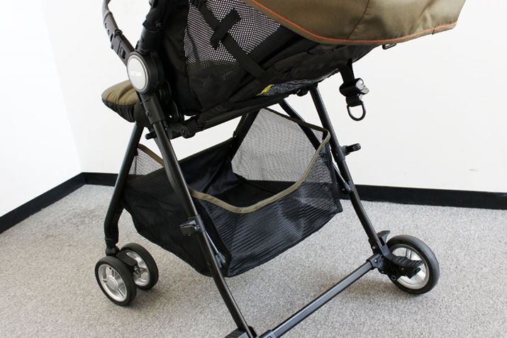 生後1か月から使えるA型ながら、わずか3.4kgという軽量化を実現。保冷剤も入れられるヘッドレストや、赤ちゃんのいたずらを防止するバックルカバーが付属するなど、快適と安全への配慮が感じられます。ただ、本体を軽くするためフレームは細めで、走行時に多少のぐらつきはあり。しかし、荷重が重くなると安定性がアップするので、赤ちゃんが大きくなっても使いやすそう。また、小回りも利いて、電柱などは最短距離で回り込めました。段差はバーに足をかければ前輪が軽く持ち上がり、電車に乗る時なども焦らずいけそうです。そして、本体が軽いので、階段の上り下りも比較的ラク。メッシュ地のシートは丸洗いできるほか、本体も骨組みになっているので通気性もいい感じです。