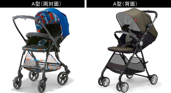 ベビーカーは、大きく「A型」と「B型」に分類されます。A型は生後1か月から使え、ほぼフラットになるまでリクライニングするのが特徴。背面でも対面でも使える両対面式が多いですが、なかには背面式のみのものもあります。また、赤ちゃんの快適性や安定性を重視しているため、装備がしっかりしており、重量が重くなる傾向。いっぽう、B型は、腰が据わり始める生後7か月頃からの使用が推奨されており、リクライニング角度はA型より浅めの110°程度となっています。背面式が基本で、安定性より軽さやコンパクトなど実用性を重視。赤ちゃんが大きくなっても押しやすく、使わない時はコンパクトに折りたためて持ち運びやすいといったのメリットがあります。いずれも3〜4歳頃まで使える仕様ですが、1歳までの使用感を重視するならA型、2〜3歳の使用感を重視するならB型がうってつけ。人によってはA型とB型の両方を用意し、使い分ける人も少なくありません。