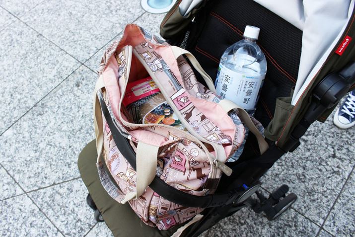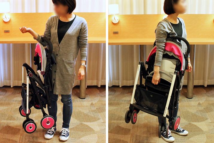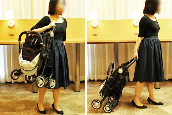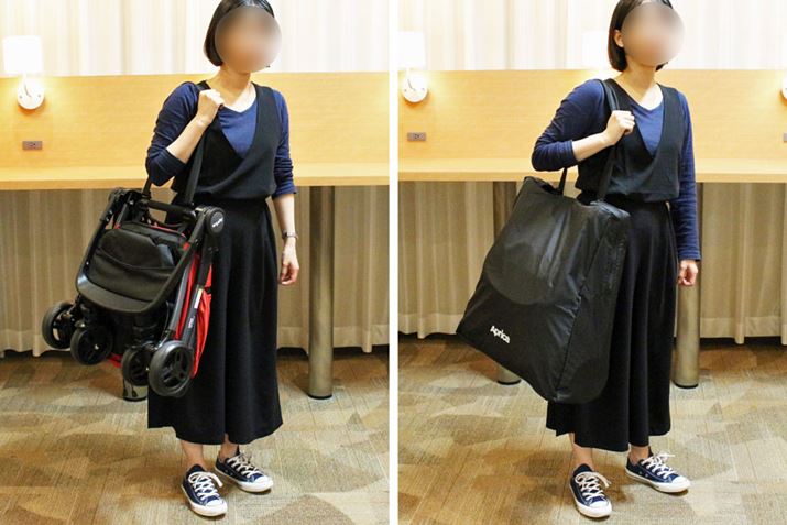 キャリーストラップを肩からかければ疲れにくく、キャスターも洋服につきません(左)。ベビーカーをすぐ使うのでなければ、付属のバッグに収納して運ぶとよさそうです