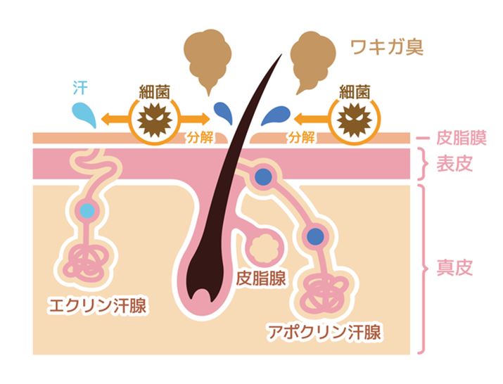 ワキの下には、全身に存在するエクリン腺と、ワキなど体毛が集中している部位に存在するアポクリン腺という2種類の汗腺があります。エクリン腺が体温調節のための汗を出すのに対し、アポクリン腺は体臭の原因となる汗を出します。ワキがにおいやすいのは、人によってはアポクリン腺がワキの下に多く存在しているから。ちなみに、エクリン腺から出る汗は元々無臭ですが、皮膚の表面で雑菌と混ざり合うことでニオイの原因になることもあるので、注意しましょう。