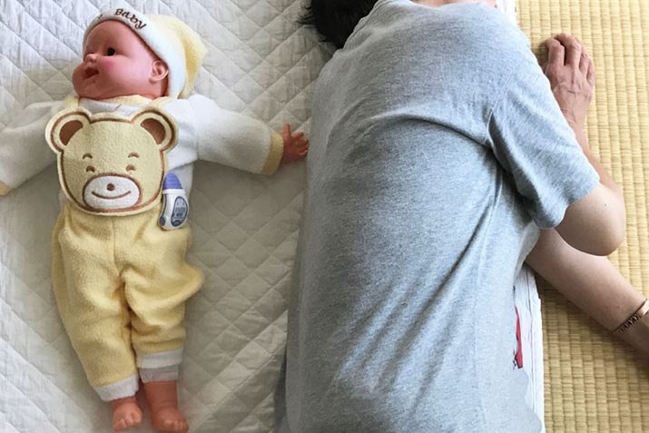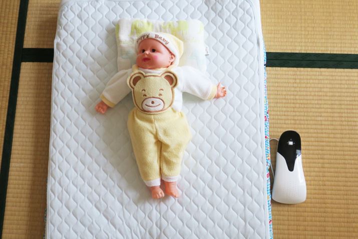 ただ、ここまでの検証では、パッドの上に何か載っていればアラーム音が鳴らないのでは? という不安も残ります。そこで、きちんと動き(呼吸)を検知しているのか確かめるために、赤ちゃんの代わりに人形を載せて試してみました。