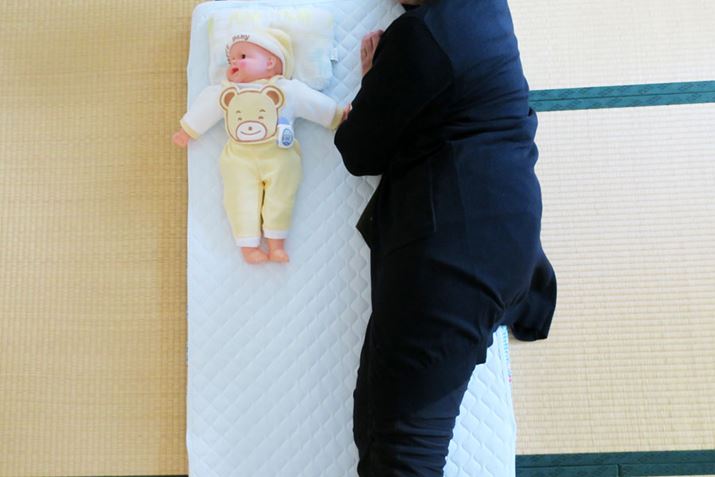 無呼吸になった赤ちゃんという設定で人形をパッドの上に置き、パッドに触れないように添い寝してみました。結果、パッドに触れていないにもかかわらず、アラーム音は鳴らず。添い寝する親の動き(呼吸)などを拾ってしまうようです