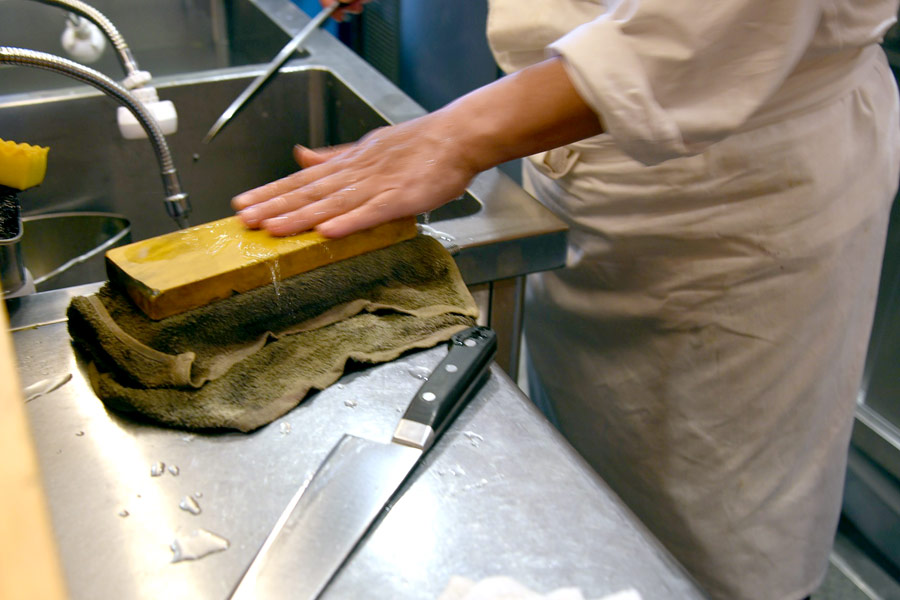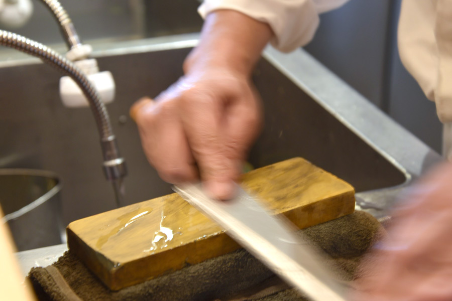 片山「カミソリくらいまで刃を立てたいときは、仕上げ砥でやります。ただ、切れ味にこだわりすぎると刃がもろくなってしまって、ちょっと身の硬いものなんかを引くとすぐに刃こぼれしてしまいます。だから仕上げ砥を使うのは、ふぐの薄造りとかそういう料理のときだけですね」
