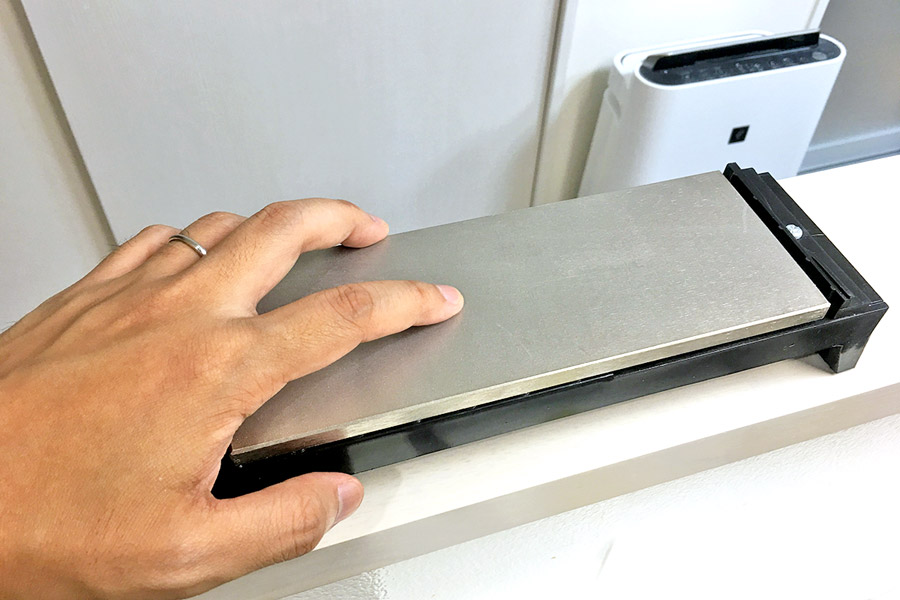 片山「今はダイヤモンド質のものが多いです。従来の砥石って使っていくうちにすり減っていってしまうんですが、ダイヤモンド質のものは『減らない砥石』といわれています。表と裏で荒砥と中砥を兼ねていて、どんどん削れてしまう。刃が早く作れるぶん、包丁の減りも早いですね。あと、石の素材でも最近はすり減りにくいものが主流です」