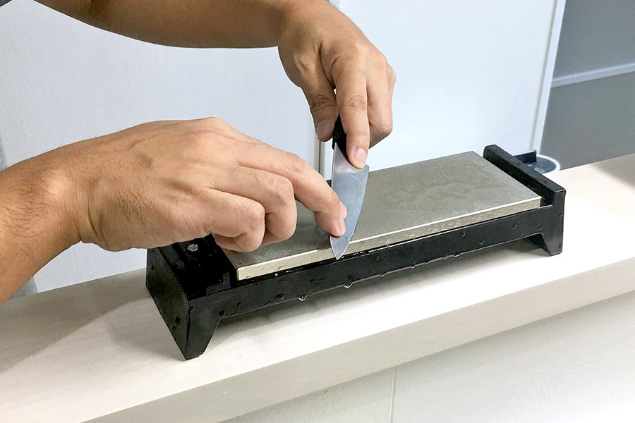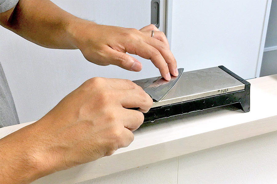 片刃の包丁の刃の部分を砥石に押し付けるようにして
