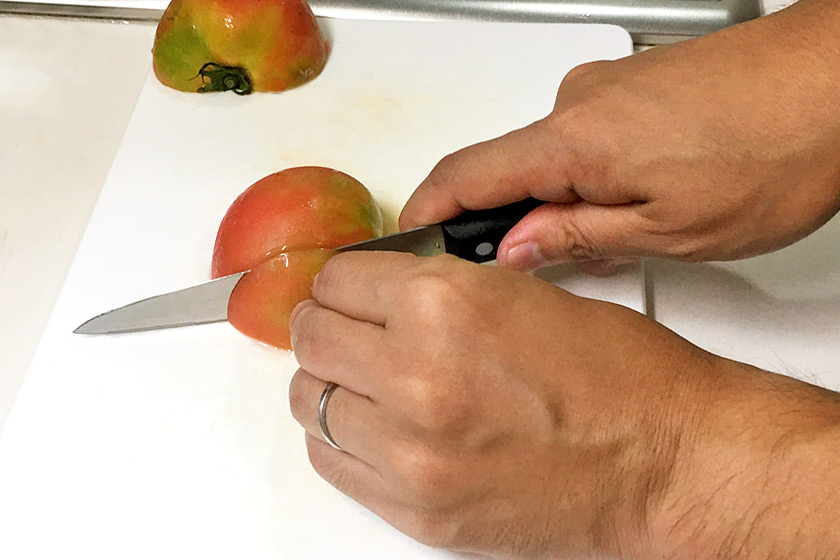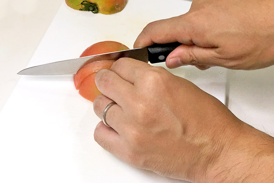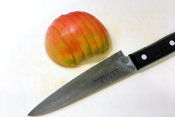 一滴の汁すらもらすことなくカットできた。トマト自身も、心なしか余裕をこいているように見える。切られたことに気付いていないのかもしれない