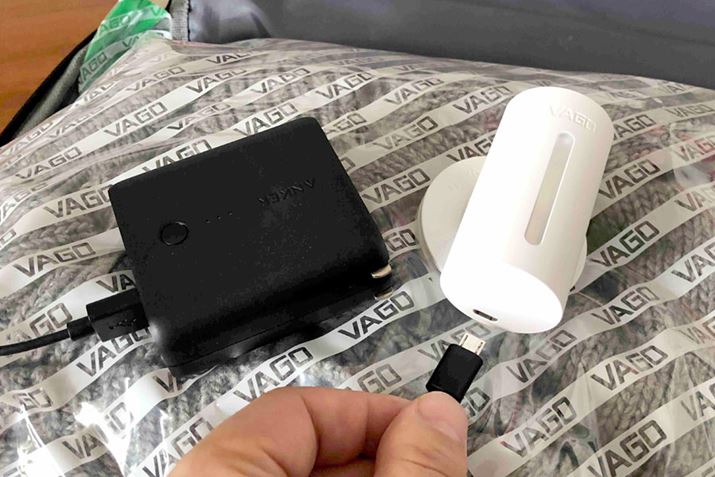 まずは、圧縮袋にたたんだ衣類を入れてファスナーを閉じます。そして、圧縮袋の中央部分にあるアタッチメントに「VAGO」を接続して固定。付属のmicro USBケーブルでモバイルバッテリーなどの外部電源につないでスイッチを押せば完了。ただし、Mサイズの専用圧縮袋の場合、圧縮が終わるまで約5分の時間を要します。圧縮する衣服類を最初に決めて圧縮袋に入れ、圧縮中にほかの荷物を整理するようにすれば効率的です。