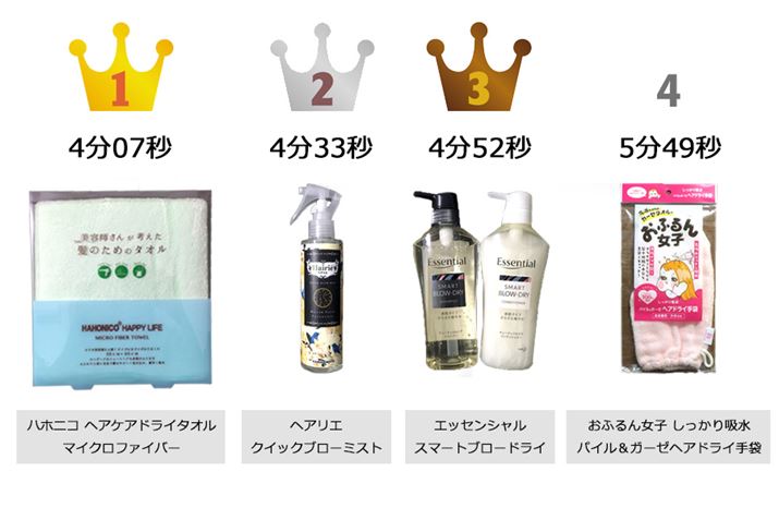 個人的には結構感動しました! 普通に乾かした場合、7分24秒だったので、1位のタオルはもう少しで1/2の時間で乾かせるということになります。何かを“つける”わけでもなく、タオルを替えただけで時短になるのってすごいなって思いました。