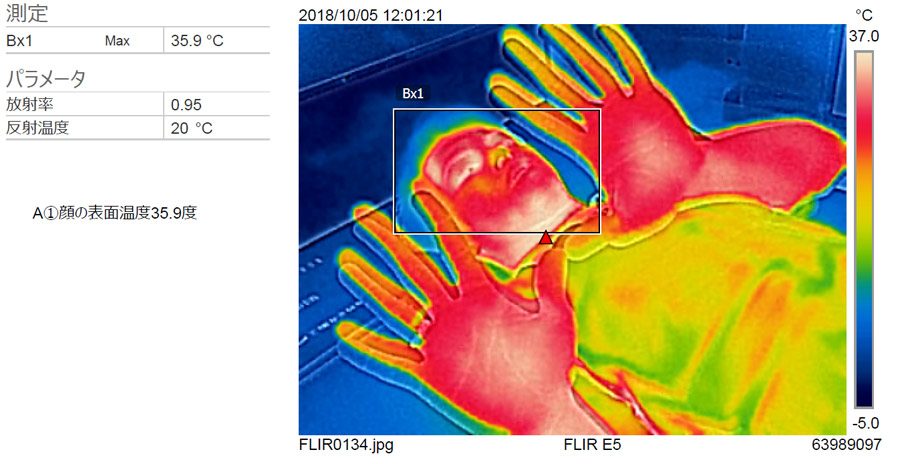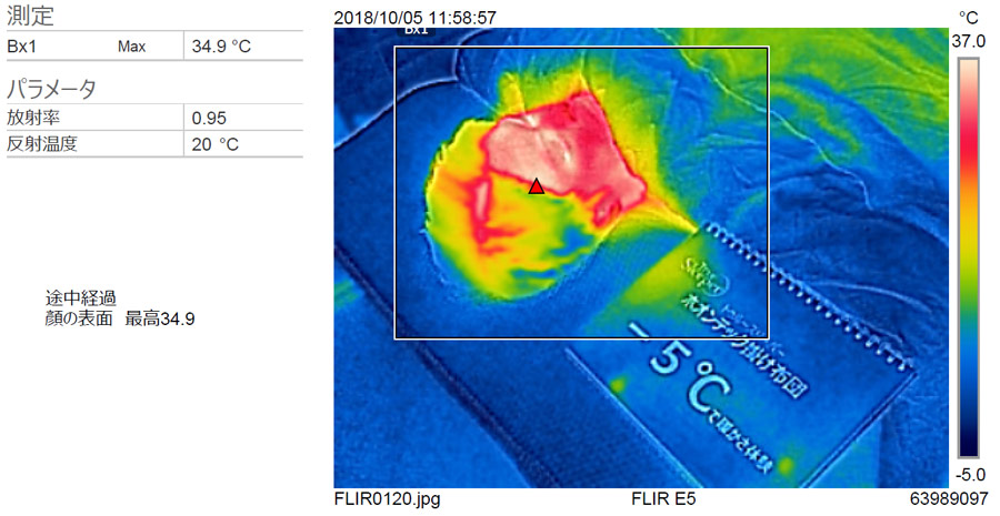 ビフォア/アフターで温度の差が出た、顔の表面最高温度で比較していこう。まずは、5分前のサーモグラフィーの結果から。