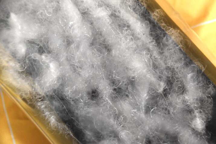 「ホオンテック掛け布団」の中身の素材に使用されている「ハイパー保温ボール」。30ミクロンの極細糸を保温力にすぐれるボール形状に特殊加工することで、糸と糸が複雑にからみ合って生まれる無数のエアポケットに暖かい空気をたっぷりとため込む。さらに、その「保温ボール」同士が長く連なっているため、羽毛と異なり綿が布団の中でかたよらない