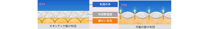 一般的な掛け布団(写真右)は、縫い目によって布団が押さえつけられていて、厚みのない「溝」が生じる。すると、その「溝」から暖まった空気が逃げたり、冷たい空気が入ったりしてしまう。いっぽう「ホオンテック掛け布団」(写真左)は、布団の厚みを均一に保つ「三角立体構造」により、布団の中の暖められた空気を逃がさずキープ。羽毛布団の1.6倍の保温力を実現しているという