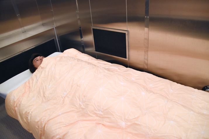 -5℃の人工気候室の中には、ベッドが設置されていた。なんかポップな拷問室のようでシュール