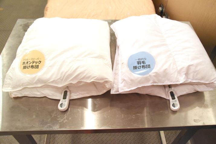 もちろん実際に、身体のどこの部位も温かさに包まれていて、5分間はとても快適だった。また、寝返りを打ったり、「ホオンテック掛け布団」を少し持ち上げてたりしても、多少冷たい空気が入ってくるものの、すぐに「ホオンテック掛け布団」が身体に吸いつくことで、冷たい空気はすぐに追い出され、温かさが戻ってくる。これなら寒い冬でも朝まで気持ちよくぐっすりと眠ることができそうだ。というか、-5℃のこの部屋でも「ホオンテック掛け布団」があれば寝られそうな気がしたくらいだ。