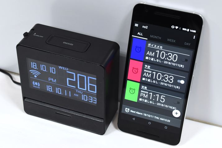 「スマートモード」では、無線LANを通じ、スマホの専用アプリやPC向けの専用Webページを使ってアラーム設定が可能。また、本機は「ボイスメモ」機能を搭載し、録音した声をアラームとして設定したり、入力したテキストを音声変換して再生音として設定できたりする。さらに、「Google カレンダー」上の予定や天気予報を音声で読み上げる機能も搭載する。