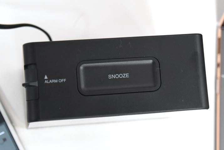 本体上部には、アラームをオン/オフするスイッチ(左)と、スヌーズボタン(中央)を搭載。スヌーズボタンを押しても、スイッチでオフにしない限り、アラームは再び鳴り出す