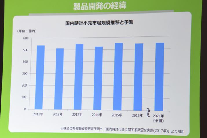 国内時計の小売市場の規模推移と予測。キングジムいわく、スマホが普及しているとはいえ、スタンドアローンの目覚まし時計の需要も変わらず一定数あるという