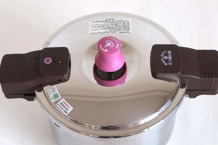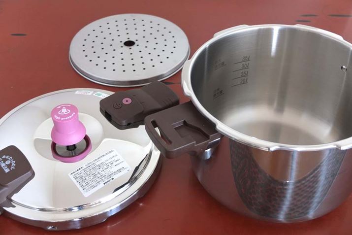 「あなたとわたしの圧力魔法鍋」の鍋底は、「ステンレス/アルミ/ステンレス」の3層構造。熱が鍋全体に均等に伝わりやすく、かつ焦げつきにくくなっているそうです。また、安全装置も、圧力調整装置(おもり)、見やすいフロート式安全装置、ステンレス製大口径安全弁、取っ手内部のスライド式安全装置の4つを装備し、初心者にも安心な設計です。