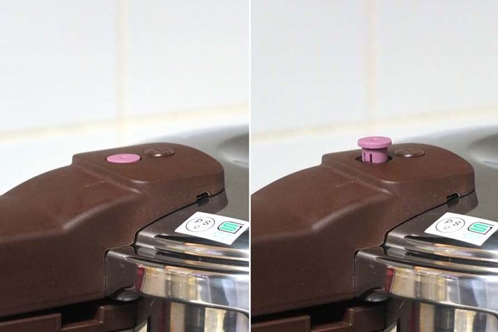 圧力調理時間が終了したら火を止めて、蒸らし(自然冷却)工程に。フロートが下がったらおもりを傾けて鍋内に残った蒸気を排出し、その後おもりを外してふたを開けます。
