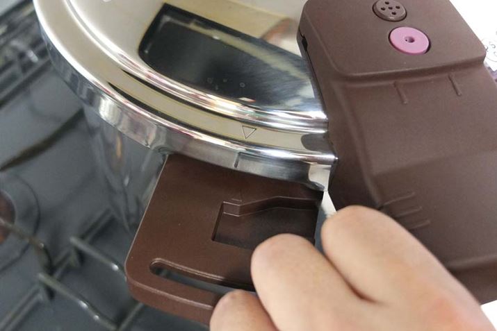 圧力鍋の使い勝手の重要要素である、ふたの開け閉めのしやすさをチェック。本製品には本体の取っ手部分とふたに「△」マークがついていて、これを合わせてからふたを閉めます。「△」マークが合うあたりで、ふたが「ふかっ」と鍋に沈み込むポイントがあるので、そこからふた側の取っ手をスライドさせて本体側の取っ手と合わせます。