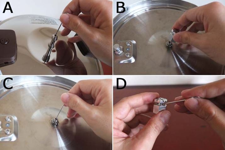 例えば圧力調整装置(おもり)を乗せるノズルに詰まりがないかを、付属の掃除ピンでチェックし(A)、裏面のノズルナットからノズルフィルターを外して(B)、これらも詰まりがないかを確認します(C、D)