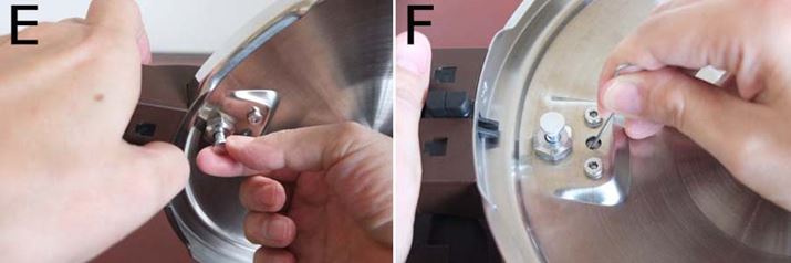 圧力ふたの構造はシンプル。裏側の凹凸も多くないのでスムーズに洗えますが、使用前には毎回、おもりを装着するノズルに詰まりがないか、フロートはスムーズに動くか、安全弁がスムーズに上下するかのチェックが必要です。