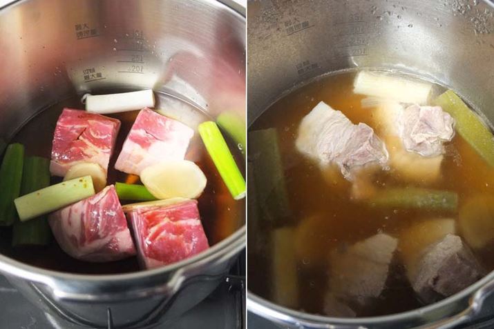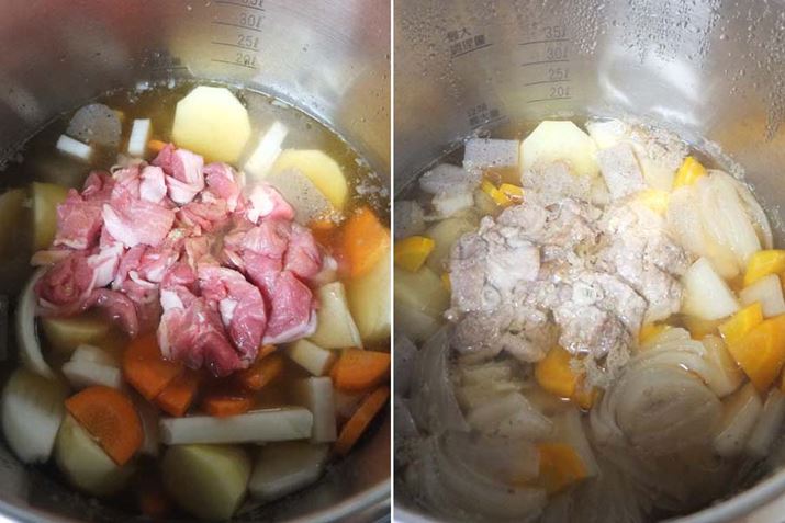 下茹で終了の時点で豚肉がかなりやわらかくなっているのが見た目にもわかります。8分間の圧力調理でここまでやわらかくなるのが「超高圧140kPa」の魅力