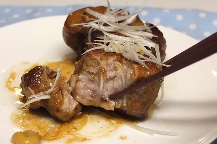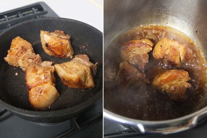 下茹でした豚ばら肉にしょうゆを塗り、フライパンでしっかり焼き目をつけ、再び鍋に戻して二度目の圧力調理。しっかり味がしみて煮汁もある程度煮詰まっていました。最後に片栗粉でとろみづけして完成です
