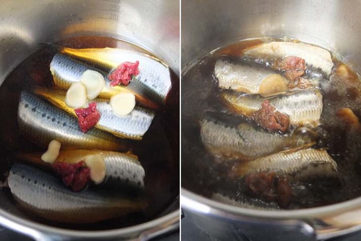 次に作ってみたのはいわしの梅干煮。レシピ集に載っていた「いわしの梅しょうが煮」のレシピに従って調理しました。工程は、鍋に頭と内臓を取ったいわし。調味料、しょうが、梅干を入れ、9分間圧力調理。フロートが下がったらふたを開け、強火にかけて煮汁を煮詰めて完成。煮汁がかなり多くて煮詰めるのに時間がかかったこともあり、調理時間は40分近くかかりましたが、火を付けてからフロートが降りるまでにかかった時間は約30分でした。